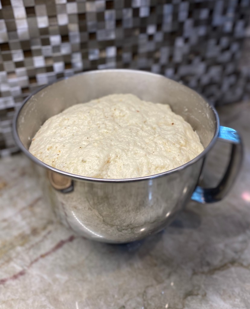 - In a mixer, add bread flour, salt, black pepper, garlic powder, red pepper flakes, anise seed, and oregano. Mix on low speed.